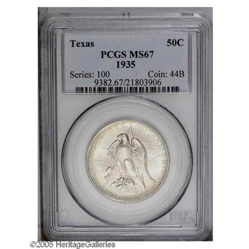 1935 50C Texas MS67 PCGS. A golden ring encircles this 1935[50C] Texas MS67 PCGS.