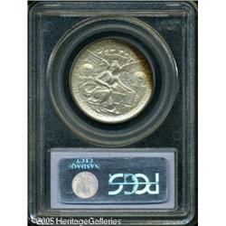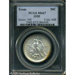 <B>1935 50C Texas MS67 PCGS.</B></I> Satiny luster is displayed under matte-like, silver-gray patina on both sides. A thin crescent of deep russet-red color also accents each side at the outermost border area. This specimen is virtually mark-free. Lot:8592