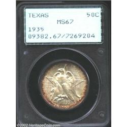1935 50C Texas MS67 PCGS. The borders have rich tobacco-brown patina and a hint of sea-green color. A lustrous Superb Gem that has exceptionally preserved surfaces. Important notice: We expect to be auctioning lots at the rate of 200-250 per hour. Sometimes eBay Premier live bid software cannot keep up with that pace, so we strongly recommend that you place a realistic proxy bid now as insurance to avoid disappointment. Also please note that all Heritage/CAA lots purchased through eBay Premier carry a 20% Buyer's Premium. Please make sure you read the Terms and Conditions.