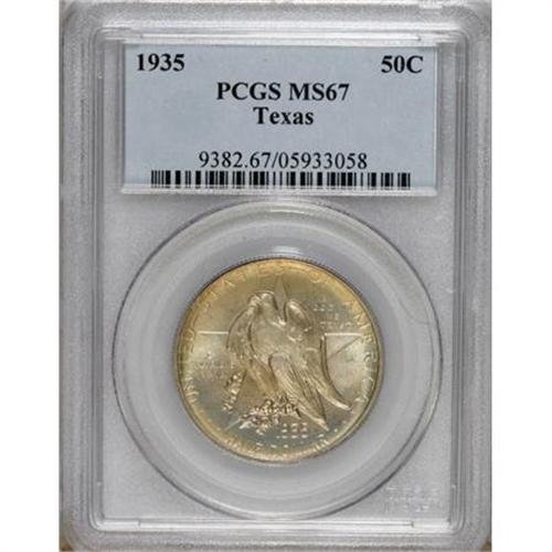 <B>1935 50C Texas MS67 PCGS.</B></I> This lovely Superb Gem has an elegant appearance. The design features are fully struck, the luster is excellent, and a pleasing antique-gold cast has settled over both sides. This is augmented by steel-blue accents in the obverse fields. Surface marks are almost nonexistent. <BR><BR><b>Shipping:</b> Coins & Currency (<a target="_blank" href="http://www.heritageauctions.com/common/shipping.php">view shipping information</a>)