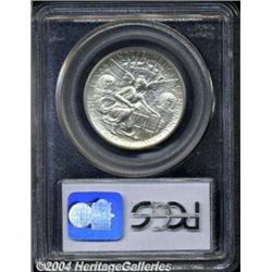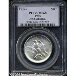 <B>1935<50C> Texas MS68 PCGS.</B></I> A fully struck Superb Gem that possesses blazing cartwheel luster and exquisite aquamarine and powder-blue patina. Even under close examination with a loupe, the surfaces fail to display even trivial blemishes. An excellent candidate for the finest collection of Commemorative Silver. While 61,463 pieces were struck of the inaugural 1934 issue, mintages were comparatively restrained for the remaining four years of the type. The 1935 had a production of less than 10,000 pieces. Population: 5 in 68, none finer (6/04).<BR><I>Ex: FUN Signature Sale (Heritage, 1/03), lot 9830, which realized $7,475.</B></I><BR><I>From the JFS Collection, the #1 All-Time PCGS Registry Set.</B></I> <BR><BR><B>Important notice:</B> Heritage usually auctions material at the rate of 200-250 lots per hour. On some occasions eBay Live bid software or the Internet may not be able to keep up with the pace of the auction. We recommend placing a realistic absentee bid now as insurance to avoid disappointment. Occasionally the auctioneer may eliminate or reject an eBay Live bid, and the auctioneer may also reopen a lot after the close of the eBay live bidding (usually because we missed an audience bid), and may reject your bid even if it shows you as the winning bidder. By bidding via eBay Live, you agree that Heritage may award the lot to another bidder at its sole discretion under the circumstances described above or any other reasonable circumstances. Since eBay bids are not shown to us until we open the lot on the floor, we treat those bids just like floor bids. In most cases the floor responds before the eBay bid is presented to us, due to Internet lag time, so for consistency we have made it a policy that floor bids are always considered first over tie eBay live bids. Also please note that all Heritage lots purchased through eBay Live carry a 20% Buyer's Premium. Please make sure you read the Terms and Conditions before you bid. </span></font></tr></table></td></tr></table>
