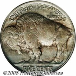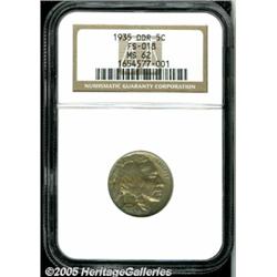 <B>1935 5C Doubled Die MS62 NGC.</B></I> FS-018. DDR 1-R-V. The entire reverse is strongly die doubled, although UNITED and FIVE exhibit the most prominent separation. According to the <I>Cherrypickers' Guide,</B></I> "this variety is extremely rare in any grade above VF." Golden-brown and rose hues grace this satiny and unmarked Buffalo Nickel. The centers are typically struck, but the remaining details are crisp, especially the bison's head.