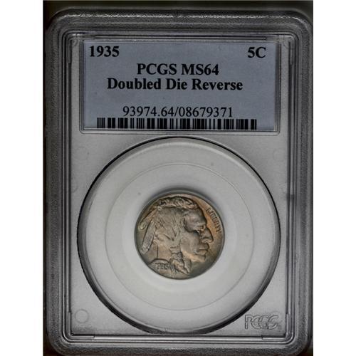 <B>1935<5C> Doubled Die MS64 PCGS.</B></I> FS-018. DDR 1-R-V. Dramatic die doubling on the reverse has shifted a copy of UNITED STATES OF AMERICA, E PLURIBUS UNUM, and FIVE CENTS southwest, along with the bison's eye, hair, and horn, all of which also show strong doubling. This phenomenally beautiful near-Gem example offers amber-cherry toning on each side, with a dollop of heather on the highpoints. The <I>Cherrypickers' Guide</B></I> says that this variety is rare above VF, with about 10 Mint State specimens known. If that is true, it is doubtful that many pieces could exceed this one in condition--and it is almost certain that none could exceed it in eye appeal. This popular <I>Guide Book</B></I> variety is unpriced above AU50 in that reference. Attributed as Doubled Die Reverse on the PCGS slab. Population: 4 in 64, 1 finer (7/06).