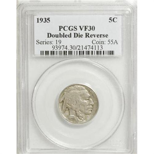 <B>1935 5C Doubled Die Reverse VF30 PCGS.</B></I> PCGS Population (6/40). NGC Census: (0/0). (#93974)<BR><BR><B>Coin Engraver:</B> James E. Fraser<BR><BR><b>Shipping:</b> Coins & Currency (<a target="_blank" href="http://www.heritageauctions.com/common/shipping.php">view shipping information</a>)