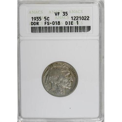<B>1935 5C Doubled Die Reverse VF35 ANACS.</B></I> Die 1, FS-018. NGC Census: (0/0). PCGS Population (4/36). (#93974)<BR><BR><B>Coin Engraver:</B> James E. Fraser<BR><BR><b>Shipping:</b> Coins & Currency (<a target="_blank" href="http://www.heritageauctions.com/common/shipping.php">view shipping information</a>)