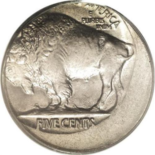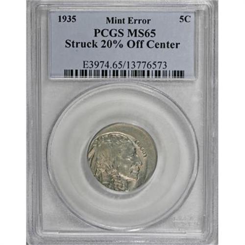 <B>1935 5C Buffalo Nickel--Struck 20% Off Center--MS65 PCGS.</B></I> Prominently off center toward 7:30, with enough of the 35 present to confirm the date. Nearly all of UNITED STATES is off the flan. This lustrous steel-gray Gem is unabraded and, because of the off center strike, has exceptional detail on the hair above the braid.<BR><BR><B>Coin Engraver:</B> James E. Fraser<BR><BR><b>Shipping:</b> Coins & Currency (<a target="_blank" href="http://www.heritageauctions.com/common/shipping.php">view shipping information</a>)