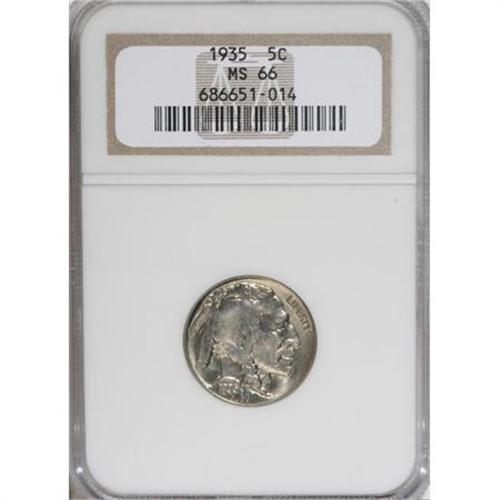 <B>1935 5C MS66 NGC.</B></I> NGC Census: (270/27). PCGS Population (452/103). Mintage: 58,264,000. Numismedia Wsl. Price for NGC/PCGS coin in MS66: $204. (#3974)<BR><BR><B>Coin Engraver:</B> James E. Fraser<BR><BR><b>Shipping:</b> Coins & Currency (<a target="_blank" href="http://www.heritageauctions.com/common/shipping.php">view shipping information</a>\)