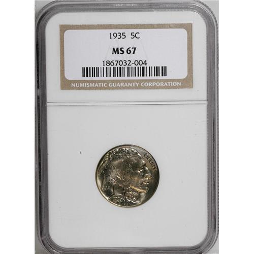 <B>1935<5C> MS67 NGC.</B></I> Blue, red-orange, and lemon-gold patina covers both sides of this stunning late-date example, perfect as a type coin. Census: 25 in 67, 0 finer (7/06).