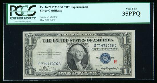 1935-A, $1 Silver Certificate. PCGS Currency Very Fine 35PPQ. . Fr-1609. This lovely mid-grade circulated "R" experimental note is problem-free for the grade, with several folds present but none are harsh or out of line for the grade.