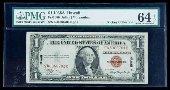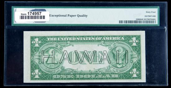 1935-A, $1 World War II Emergency Note. Hawaii. PMG Choice Uncirculated 64EPQ. . Fr-2300. This near-Gem Hawaii is formerly from the collection of noted collector Dave Rickey, as noted on the holder.