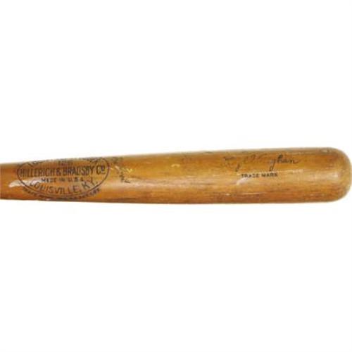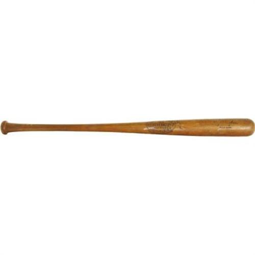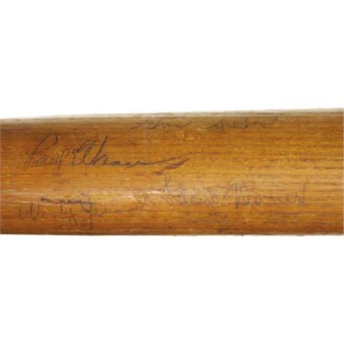 <B>1935 Arky Vaughan Game Used Bat Signed by Pittsburgh Pirates Team.</B></I> Exceedingly scarce signature model Hillerich & Bradsby dates to the most productive offensive season in the career of this Hall of Fame shortstop, one in which he posted National League-leading numbers in batting average (.385), slugging percentage (.607), and runs created (147). While the details of the Hillerich & Bradsby center trademark date the model to the 1934 or 1937 labeling period, the thrilling addition of eight bold black ink signatures (average 8+/10) allow us to peg the bat's use to the 1935 season. Joining the autograph of Arky himself are both Paul and Lloyd Waner, Jensen, Blanton, Grace, Herman and Suhr. As Babe Herman's service to the Pirates franchise was limited to just twenty-six games of the 1935 season, the evidence linking this bat to the 1935 campaign is airtight. The bat shows evidence of outstanding use, with an area of punished wood presenting ball marks and grain separation just below Vaughan's facsimile signature in accordance with his left-handed swing. A cracked handle ended the bat's long service to the Buccaneer cause. A small amount of paint upon the bat's surface must be noted in the interest of full disclosure, though this is of no real concern. Length and weight are thirty-five inches and thirty-four and a half ounces respectively. The bat comes to us directly from Vaughan's cousin, who was just two years old when Arky tragically lost his life at age forty in a fishing boat accident. She still lives in the state that gave Floyd his distinctive nickname, and supplies a letter of provenance to accompany this marvelous offering. It has been reported that fewer than ten Vaughan game used bats are known to the hobby, and surely this must be the only autographed example. An elite piece as worthy of a place in Cooperstown as Arky himself. Graded GU8. <I>LOA from Taube & Malta. LOA from PSA/DNA (autographs). LOA from James Spence Authentication (autographs).</B></I><BR><BR><b>Shipping:</b> Bats, Clubs, Sticks, Swords, Rif (<a target="_blank" href="http://www.heritageauctions.com/common/shipping.php">view shipping information</a>)