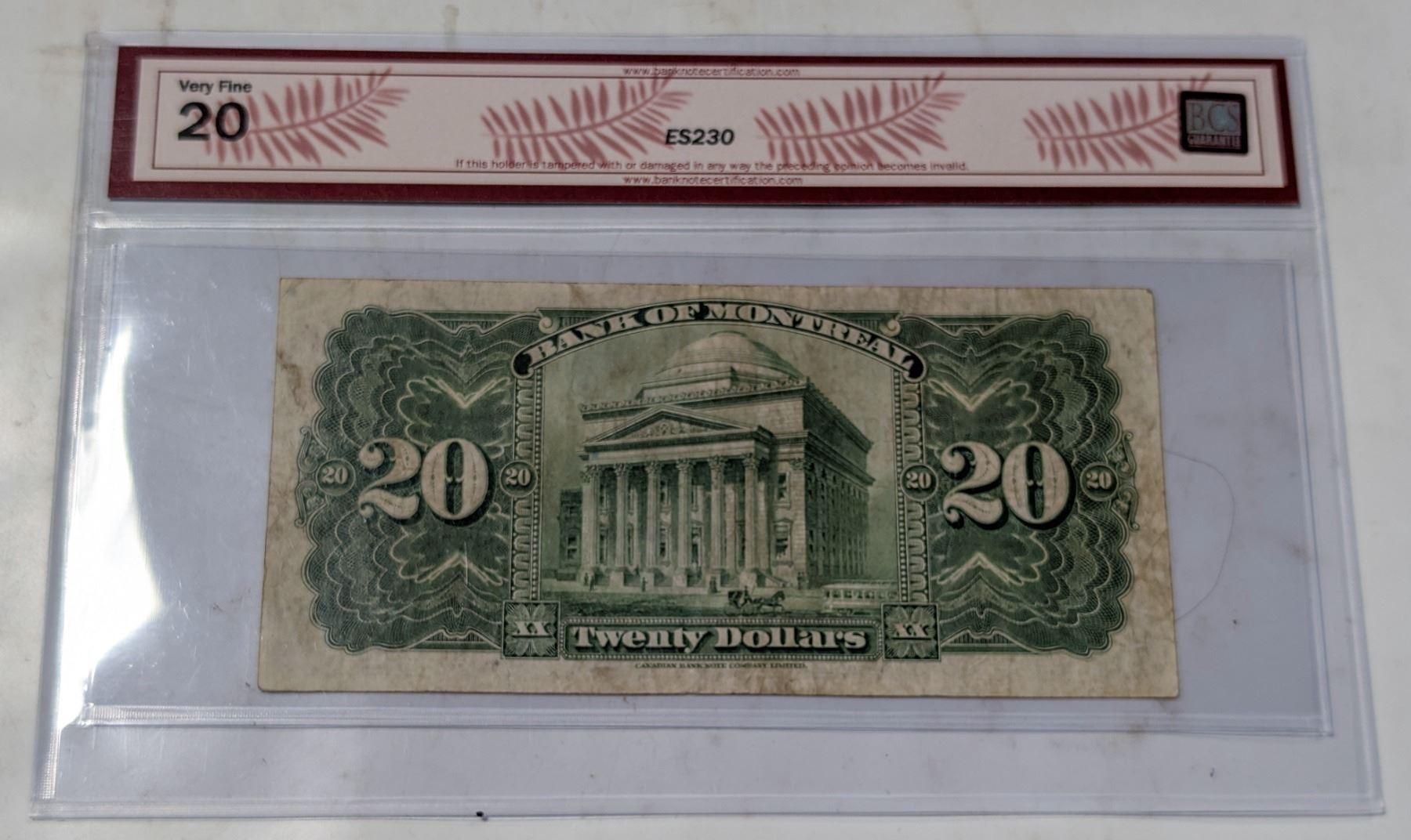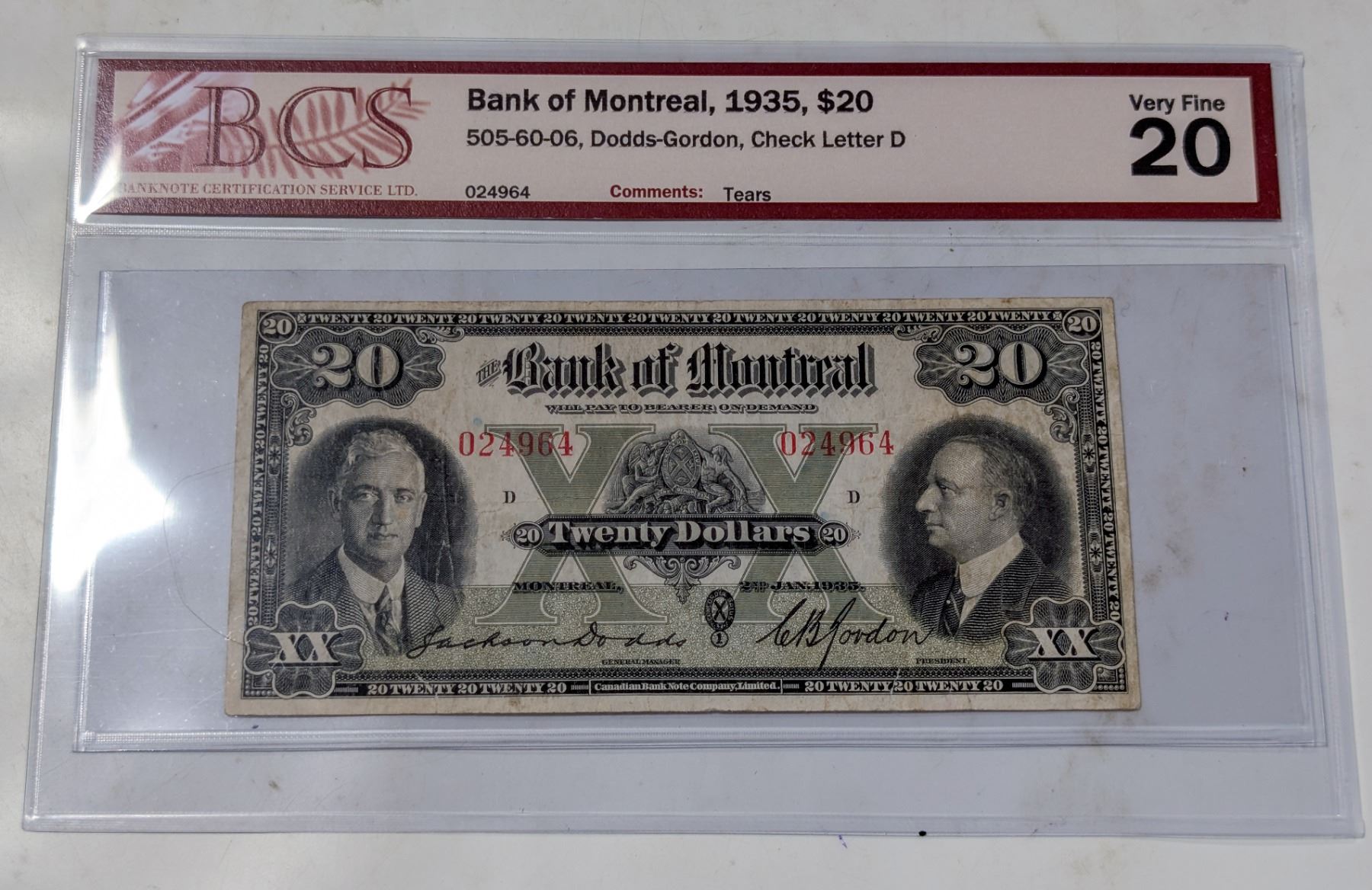 1935 BANK OF MONTREAL $20 BANKNOTE. CERTIFIED.
