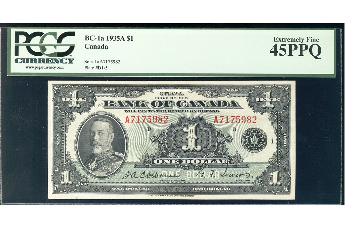 1935 Bank of Canada; 1 Dollars, BC-1a #7175982 PCGS EF45PPQ.