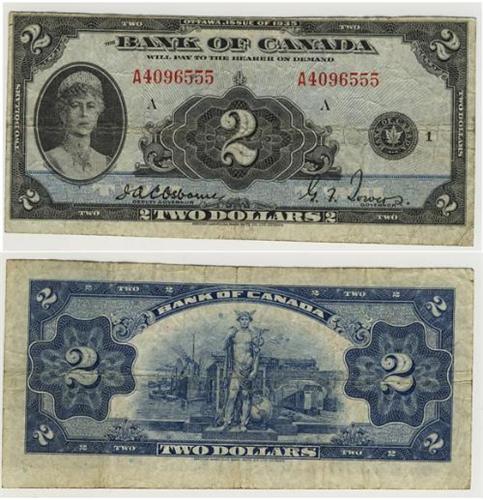 Queen Mary note, English variety Series A. Heavy folds with 1 very minor border nick at top left. Offcut at top border on the face, back looks fairly well centered. Serial #A4096555, BC-3.