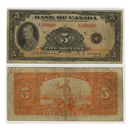 Decent circulated VG, folds & creases. Lightly soiled and minor edge wear. Lightly offcut at top border with minor vertical cut beside the small 5 serif centre left. Serial #A106668, Osbourne-Towers (no return).