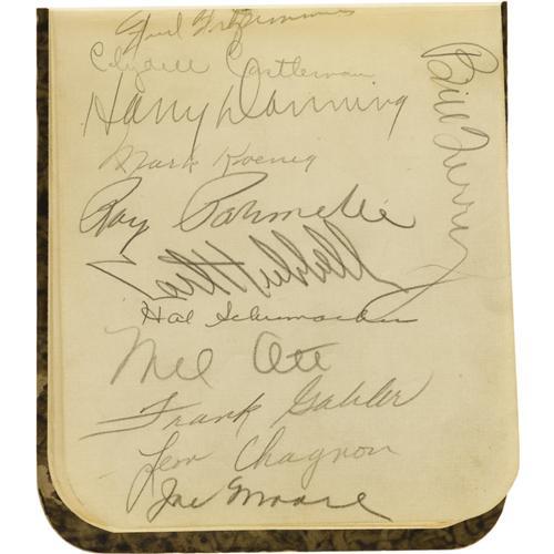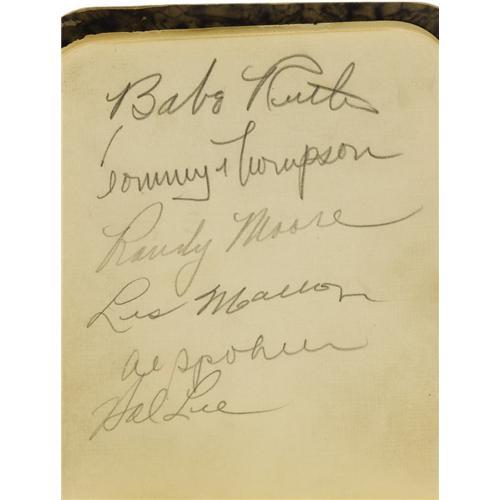<B>1935 Baseball Autograph Book Signed by Babe Ruth, Mel Ott & More.</B></I> The opening page of this charming little volume, listing team names and hotels, suggests that young Harold Kolicak acquired these autographs as the result of patient waiting in hotel lobbies with pencil in hand. The enterprising young man was quite fastidious with his acquisitions as well, making sure that teams remained together on facing pages, and that only one side of any page was used. The result is quite impressive. Over eighty autographs are here in total, applied in 9+/10 pencil unless otherwise noted. The most noteworthy names: Ruth, Ott, Hubbell, Terry, Hartnett, Medwick, Durocher (10/10 pen), Paul Dean (10/10 pen), Vance, Lopez and pitcher of Babe Ruth's sixtieth in 1927, Tom Zachary. Tremendous break down value here, and remember, all pages have autographs on one side only. It would be a bit of a shame, however, to disassemble such an obvious labor of love. <I>LOA from PSA/DNA. LOA from James Spence Authentication.</B></I><BR><BR><b>Shipping:</b> Flat Material, Small (<a target="_blank" href="http://www.heritageauctions.com/common/shipping.php">view shipping information</a>)