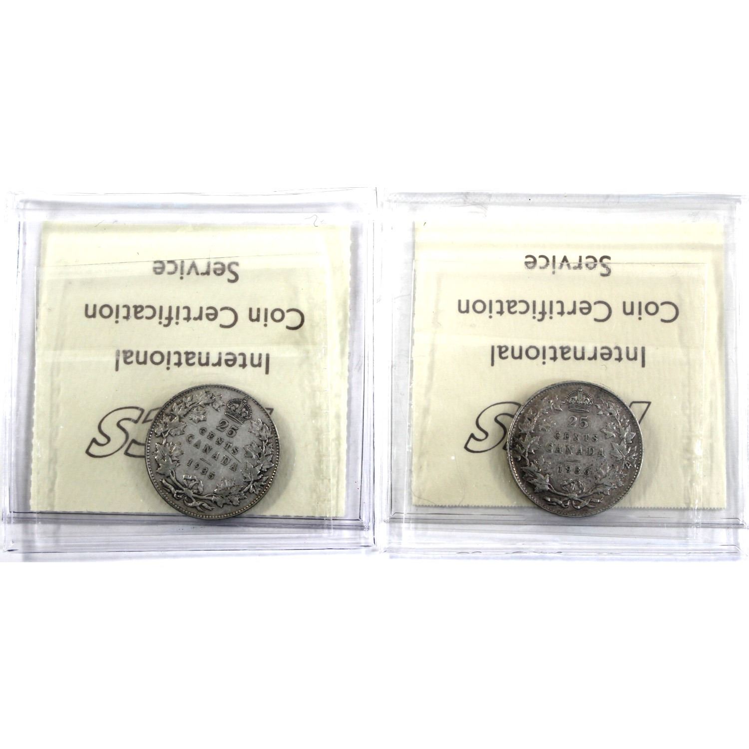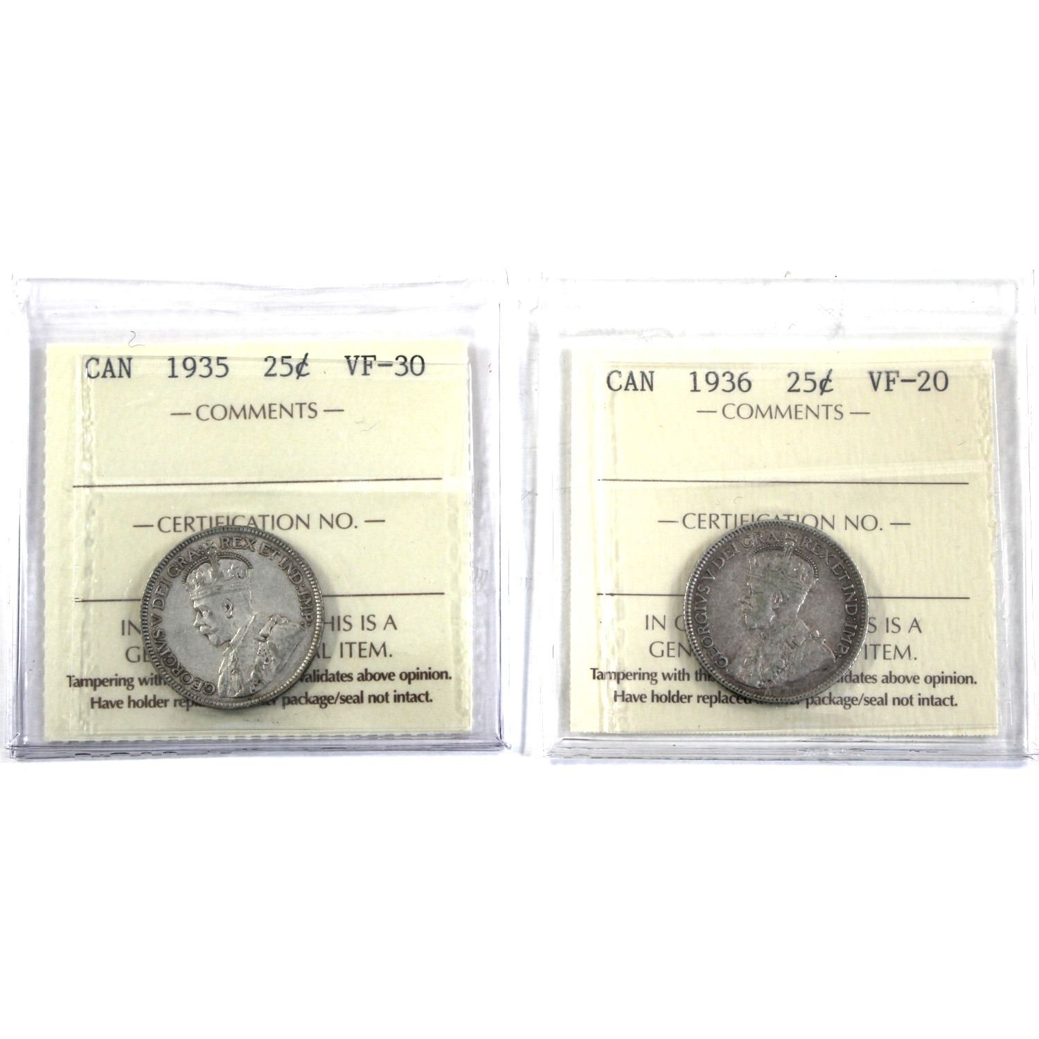 1935 Canada 25-cent ICCS Certified VF-30 & 1936 25-cent ICCS VF-20. 2pcs