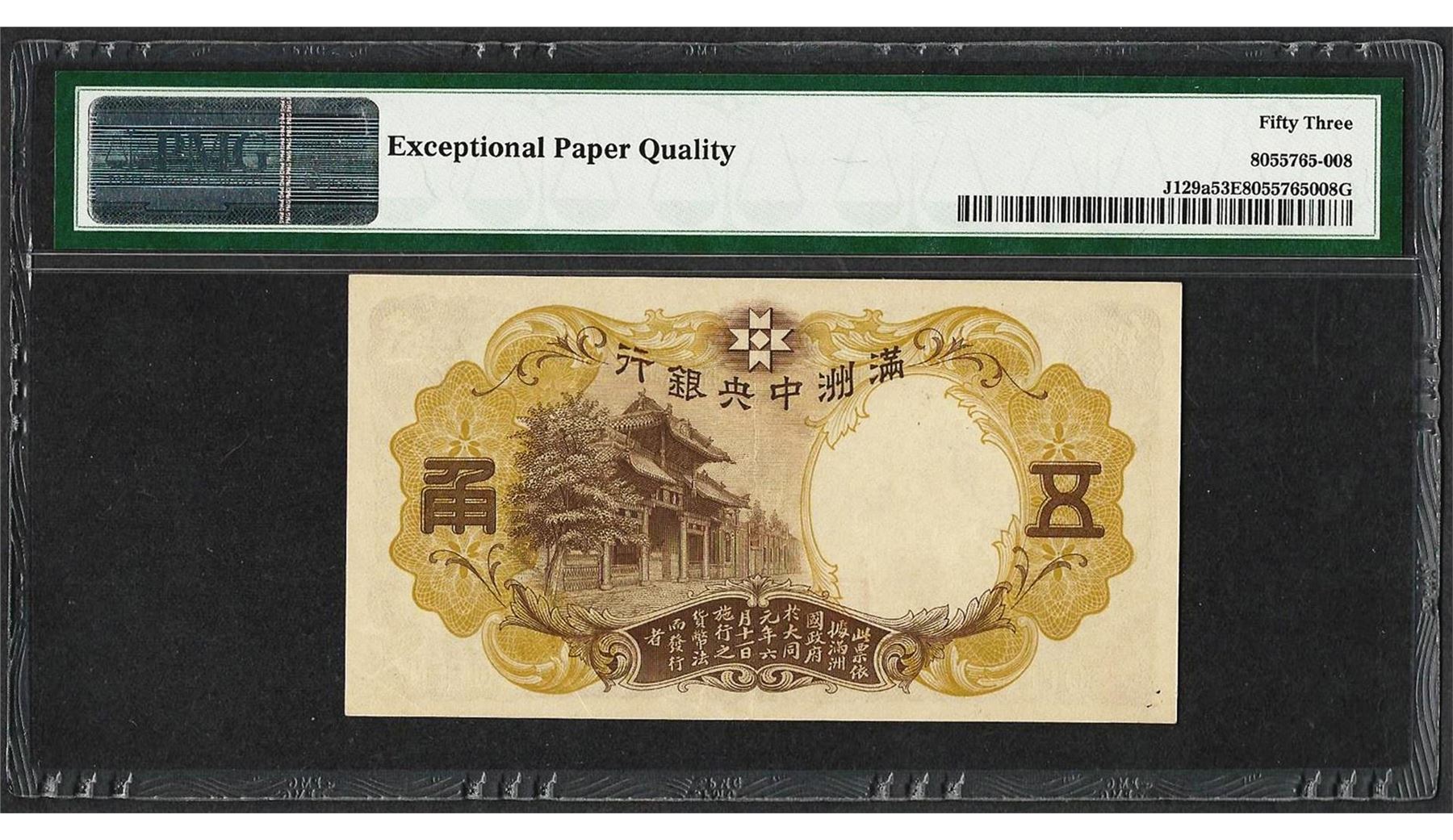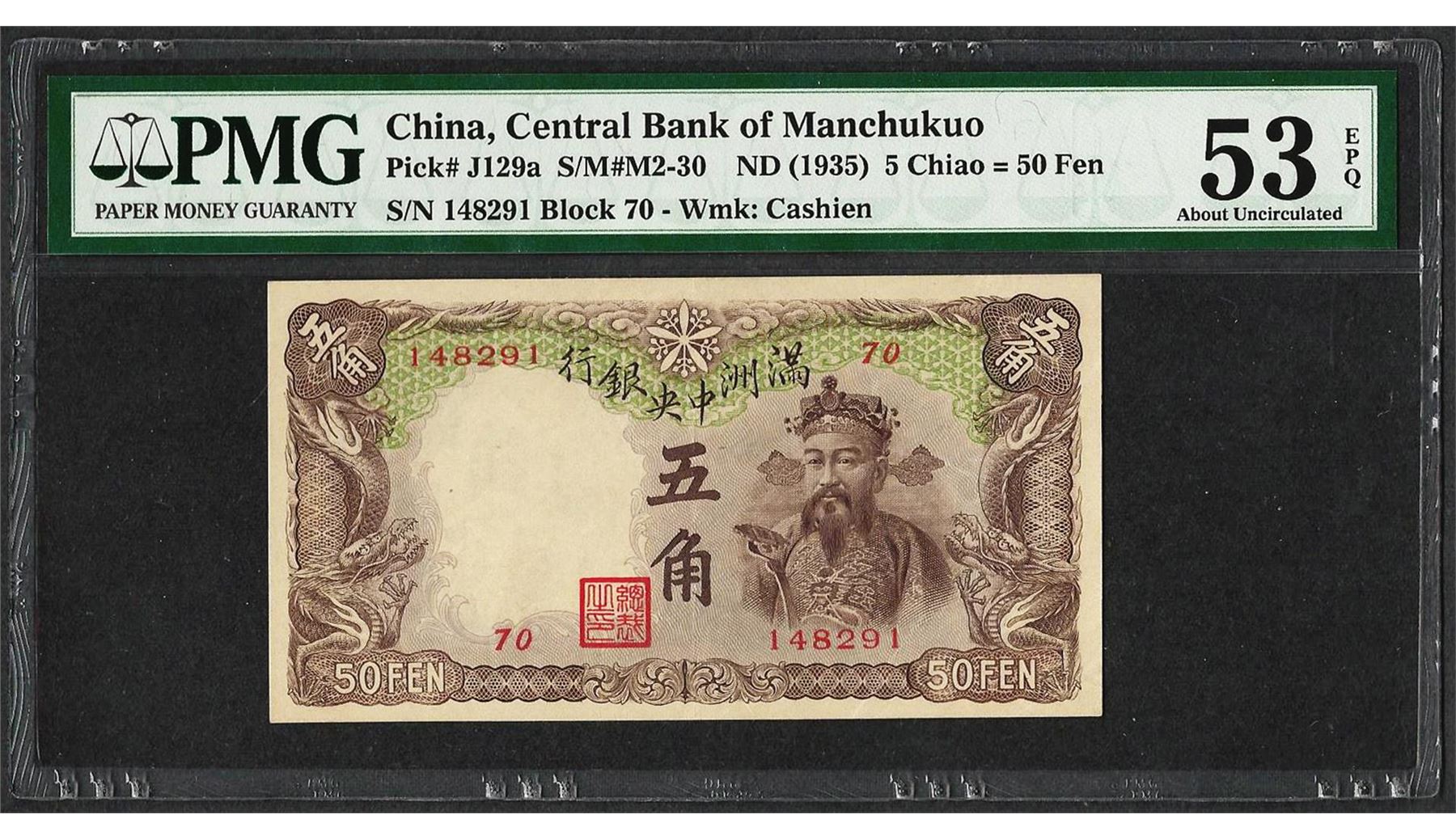 One 1935 Central Bank of Manchukuo China 5 Chiao 50 Fen PMG About Uncirculated 53EPQ. PMG Certified.