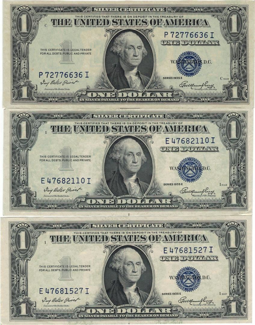 1935 Choice Uncirculated $1 Silver Certificate Currency Lot of 3.