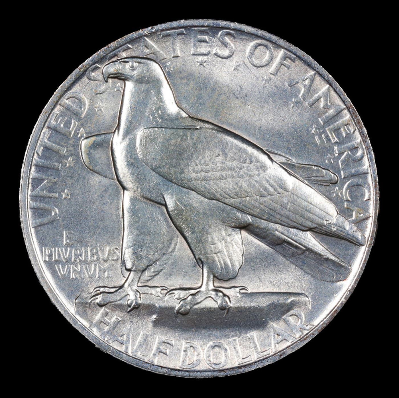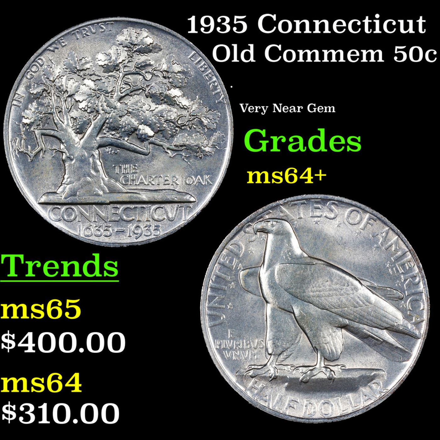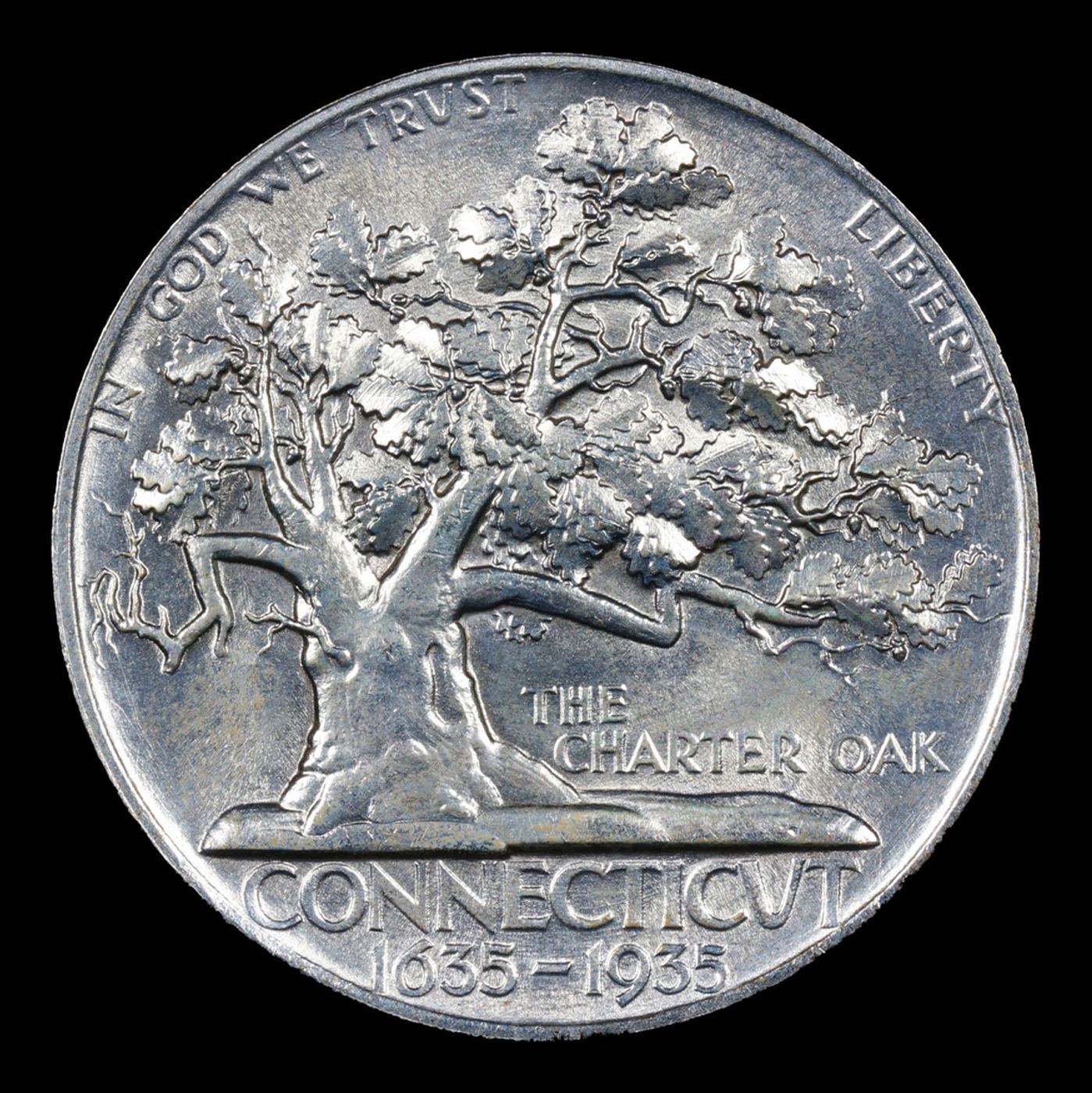 1935 Connecticut Old Commem Half Dollar 50c Grades Choice+ Unc. A commemorative coin issue was approved to celebrate the 300th anniversary of the founding of the colony of Connecticut. The design for the 1935 Connecticut Tercentenary Half Dollar would be quite striking art Deco representations of an oak tree and bald eagle.The famous Charter Oak appears on what is usually considered to be the obverse of the coin. This is where the colonists hid their royal charter when King James II sought to confiscate it. The representation of the tree is based on a painting by Charles DeWolf held by the Connecticut Historical Society. The proportions of the leaves are expanded for dramatic effect. The reverse of the coin (which Mint records actually refer to as the obverse) features a bald eagle with particularly stark and minimalistic features. Both sides of the coin were designed by Henry Kreis.The 1935 Connecticut Half Dollar had a relatively modest maximum authorized mintage of 25,000 coins. The net distribution including coins struck for assay was 25,018 after the entire issue sold out. When evaluating this issue, attention should be paid to the broad, flat area of the eagle’s wing, which tends to have hairlines or friction marks.