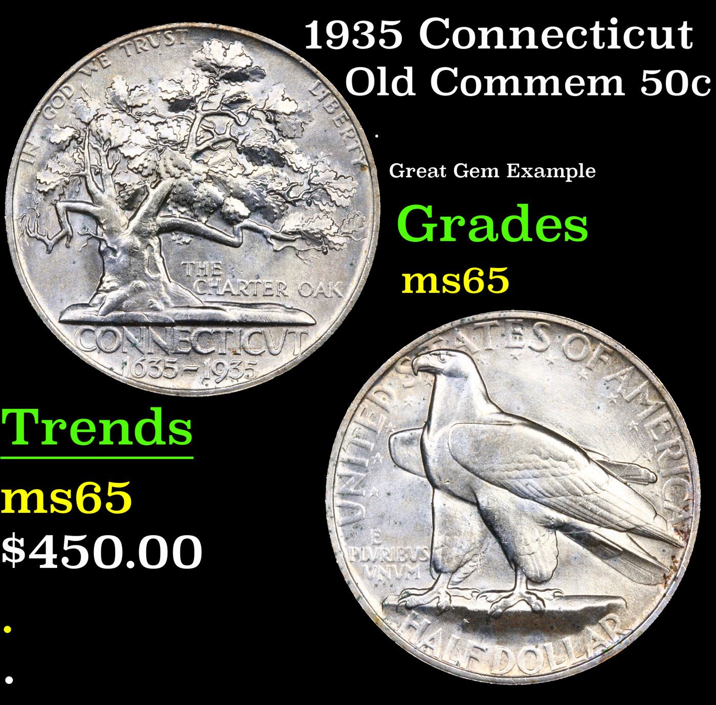 1935 Connecticut Old Commem Half Dollar 50c Grades GEM Unc. A commemorative coin issue was approved to celebrate the 300th anniversary of the founding of the colony of Connecticut. The design for the 1935 Connecticut Tercentenary Half Dollar would be quite striking art Deco representations of an oak tree and bald eagle.The famous Charter Oak appears on what is usually considered to be the obverse of the coin. This is where the colonists hid their royal charter when King James II sought to confiscate it. The representation of the tree is based on a painting by Charles DeWolf held by the Connecticut Historical Society. The proportions of the leaves are expanded for dramatic effect. The reverse of the coin (which Mint records actually refer to as the obverse) features a bald eagle with particularly stark and minimalistic features. Both sides of the coin were designed by Henry Kreis.The 1935 Connecticut Half Dollar had a relatively modest maximum authorized mintage of 25,000 coins. The net distribution including coins struck for assay was 25,018 after the entire issue sold out. When evaluating this issue, attention should be paid to the broad, flat area of the eagle’s wing, which tends to have hairlines or friction marks.