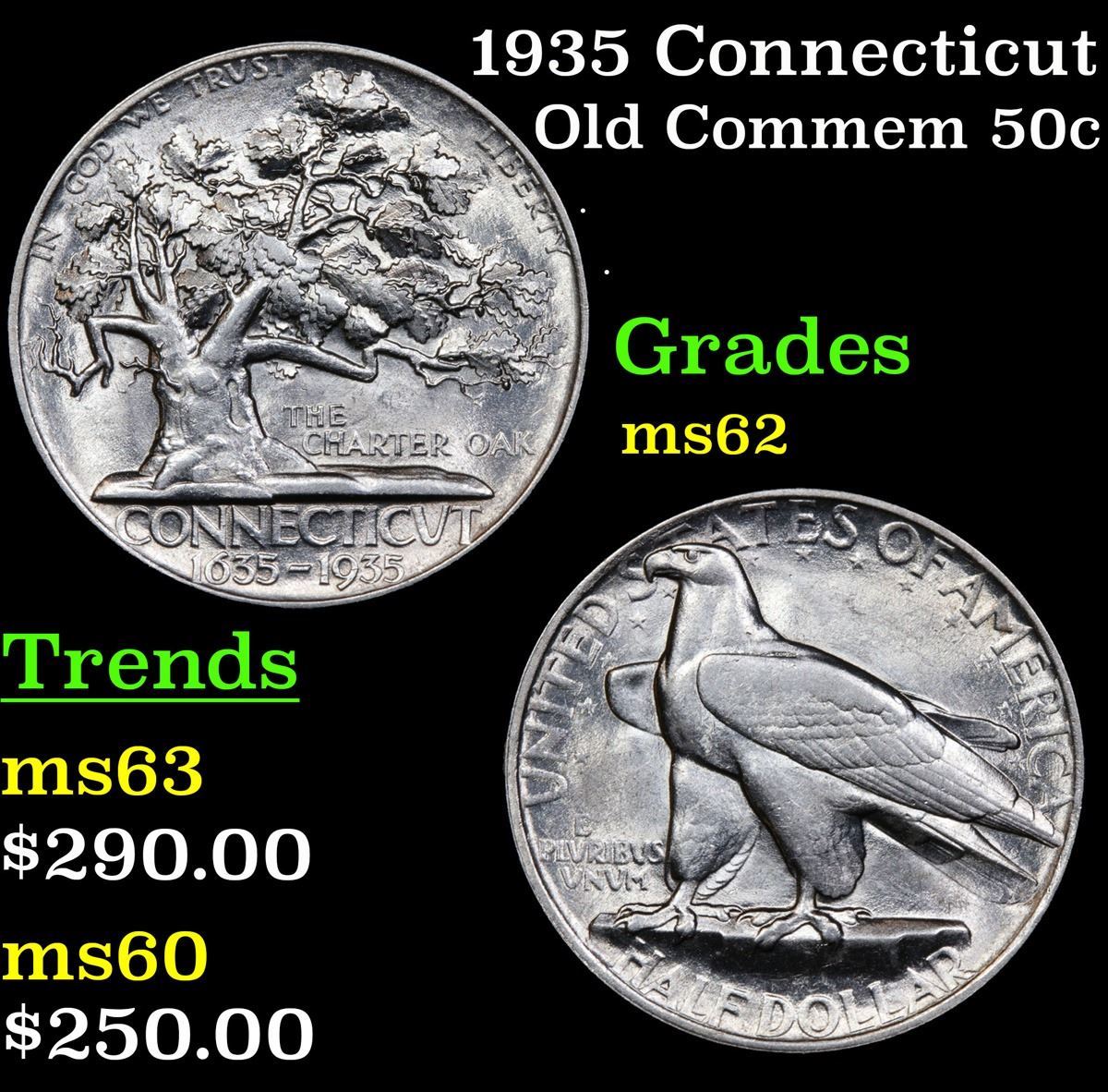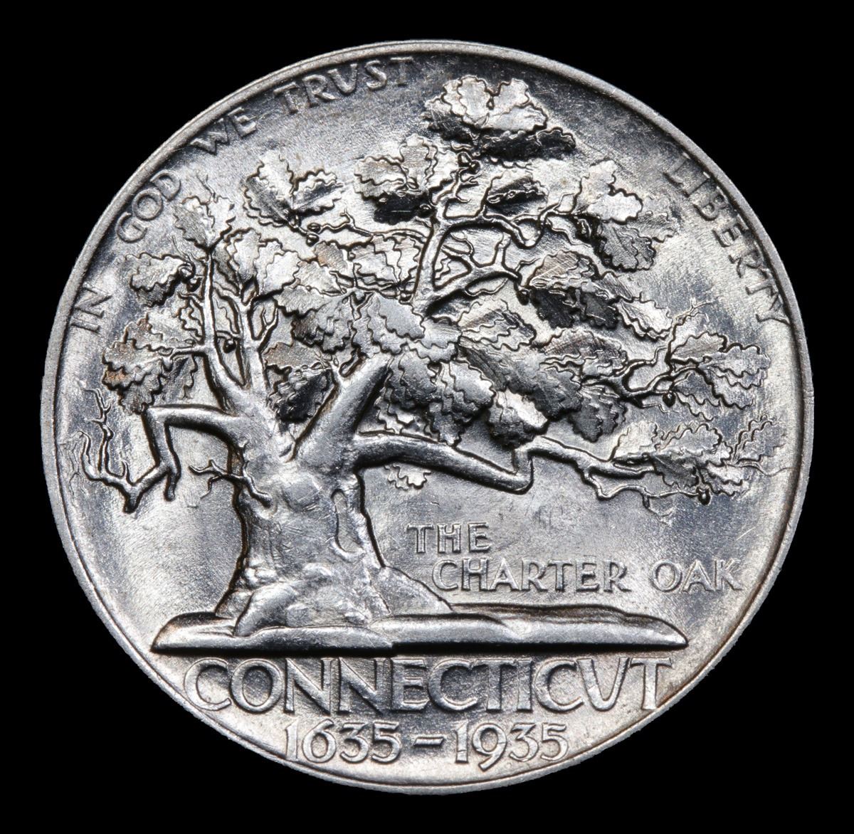 1935 Connecticut . . Old Commem Half Dollar 50c Grades Select Unc. The Connecticut Commemorative was very short produced with only 25K produced and they sold out almost immediately, unlike most other commems of the era. When examining a Connecticut Commem for wear Check at the base of the tree and on the upper part of the eagle’s wing.
