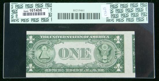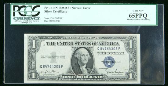 1935-D, $1 Silver Certificate. Narrow. Misaligned Back Printing. PCGS Gem New 65PPQ. . Fr-1613N. This lovely Gem is well margined and nicely centered on the face, but when the note is flipped to show the back it is obviously misaligned, with part of the note at right showing on the back.