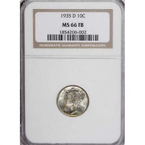 <B>1935-D 10C MS66 Full Bands NGC.</B></I> This lot presents an exceptional 1935-D dime, in that all of the design features are impressively struck, including not just the full middle bands, but the peripheral elements as well. Both of these areas are typically weak (David Lange, 2005). Radiant luster issues from impeccably preserved surfaces that are visited by whispers of red, gold-brown, and light green toning, especially on the obverse. Census: 30 in 66 Full Bands, 4 finer (5/07).<BR><BR><b>Shipping:</b> Coins & Currency (<a target="_blank" href="http://www.heritageauctions.com/common/shipping.php">view shipping information</a>)
