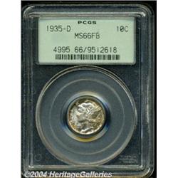 <B>1935-D<10C> MS66 Full Bands PCGS.</B></I> Variegated sea-green and russet-gold colors dominate the borders of this shimmering and sharply impressed premium Gem. A lovely high grade souvenir of the Great Depression. Population: 66 in 66, 14 finer (7/04).<BR><I>From The Reed Hawn Collection of Mercury Dimes.</B></I> <BR><BR><B>Important notice:</B> Heritage usually auctions material at the rate of 200-250 lots per hour. On some occasions eBay Live bid software or the Internet may not be able to keep up with the pace of the auction. We recommend placing a realistic absentee bid now as insurance to avoid disappointment. Occasionally the auctioneer may eliminate or reject an eBay Live bid, and the auctioneer may also reopen a lot after the close of the eBay live bidding (usually because we missed an audience bid), and may reject your bid even if it shows you as the winning bidder. By bidding via eBay Live, you agree that Heritage may award the lot to another bidder at its sole discretion under the circumstances described above or any other reasonable circumstances. Since eBay bids are not shown to us until we open the lot on the floor, we treat those bids just like floor bids. In most cases the floor responds before the eBay bid is presented to us, due to Internet lag time, so for consistency we have made it a policy that floor bids are always considered first over tie eBay live bids. Also please note that all Heritage lots purchased through eBay Live carry a 20% Buyer's Premium. Please make sure you read the Terms and Conditions before you bid. </span></font></tr></table></td></tr></table>