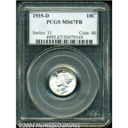 <table><tbody><tr><td><table> <TR><TD width="100%"><TABLE cellSpacing=1 cellPadding=3 width="100%" border=0><TBODY><TR><TD width="100%" bgColor=#79735c><FONT face=arial color=#ffffff size=3><B>Description</B> </FONT></TD></TR><TR><TD width="100%" bgColor=#ffffff><FONT face=arial size=2><B>1935-D 10C MS67 Full Bands PCGS.</B></I> Among those Mercury dime issues produced between 1934 and 1940, the 1935-D and 1939-S are on par in terms of high grade rarity. The present example displays incredibly well produced features and smooth surfaces that guarantee its near Condition Census standing. The lack of toning allows the bright mint frost to leap from the surfaces with undiminished intensity. A coin that no advanced collection should be without. NGC and PCGS combined report only 12 coins at the present level and none finer (11/03). </FONT></TD></TR></TBODY></TABLE></TD></TR></TBODY></TABLE><BR><A name=PricesRealized></A><TABLE cellSpacing=0 cellPadding=0 width="100%" bgColor=#000000 border=0><TBODY><TR><TD width="100%"><TABLE cellSpacing=1 cellPadding=3 width="100%" border=0><TBODY><TR><TD width="100%" bgColor=#79735c><A name=PR><FONT face=arial color=#ffffff size=3><B>Previous Prices from Heritage Auctions</B> </FONT></A></TD></TR><TR><TD bgColor=#f6f6ed><TABLE cellSpacing=0 cellPadding=0 width="100%" border=1><TBODY><TR><TD align=middle width="33%"><B>Date</B></TD><TD align=middle width="33%"><B>Service</B></TD><TD align=middle width="33%"><B>Price</B></TD></TR><TR bgColor=whitesmoke><TD width="33%"><B>09/28/2002</B></TD><TD width="33%">NGC</TD><TD width="33%">$7,475.00</TD></TR><TR bgColor=whitesmoke><TD width="33%"><B>11/01/1996</B></TD><TD width="33%">NGC</TD><TD width="33%">$467.50</TD></TR></TBODY></TABLE></TD></TR><TR><TD bgColor=#ffffff><FONT face=arial size=1 ?>PLEASE NOTE: All prices realized reflect the final hammer price PLUS the buyer's premium in auctions that charge a buyer's premium. Each item has a notation at the top of the listing indicating whether that lot included a buyer's premium. Example: A item that sells with a final hammer price of $100 and a 20% buyer's premium will display with a price realized of $120. All information listed is intended to be as accurate as possible, but errors are possible. Please use this guide carefully and inform us of any inaccuracies. </FONT></TD></TR></TBODY></TABLE></TD></TR></TBODY></TABLE><BR><TABLE cellSpacing=0 cellPadding=0 width="100%" bgColor=#000000 border=0><TBODY><TR><TD width="100%"><TABLE cellSpacing=1 cellPadding=3 width="100%" border=0><TBODY><TR><TD width="100%" bgColor=#79735c colSpan=6><FONT face=arial color=#ffffff size=3><B>Price Guide*</B> </FONT></TD></TR><TR bgColor=#f6f6ed><TD align=middle><B>Grade</B> </TD><TD align=middle><B>Coin World<BR>(Trends)</B> </TD><TD align=middle><B>Numismedia<BR>Retail</B> </TD><TD align=middle><B>Numismedia<BR>Wholesale</B> </TD><TD align=middle><B>Coin<BR>Universe</B> </TD><TD align=middle><B>Heritage<BR>Value Index</B> </TD></TR><TR bgColor=#ffffff><TD align=middle>66</TD><TD align=right>---</TD><TD align=right>$840.00</TD><TD align=right>$675.00</TD><TD align=right>$1,000.00</TD><TD align=right>$853.13</TD></TR><TR style="FONT-WEIGHT: bold" bgColor=#cccfdd><TD align=middle>67</TD><TD align=right>---</TD><TD align=right>---</TD><TD align=right>$8,500.00</TD><TD align=right>$6,000.00</TD><TD align=right>$4,200.00</TD></TR><TR bgColor=#ffffff><TD align=middle>68</TD><TD align=right>---</TD><TD align=right>---</TD><TD align=right>---</TD><TD align=right>---</TD><TD align=right>---</TD></TR><TR bgColor=#ffffff><TD colSpan=6><FONT size=1>*All information listed is intended to be as accurate as possible, but errors are possible. No item may be returned or refused based on this information which is provided as a service to our customers. You should contact each pricing source directly to determine the accuracy of this information. </FONT></TD></TR></TBODY></TABLE></TD></TR></TBODY></TABLE><BR><TABLE cellSpacing=0 cellPadding=0 width="100%" bgColor=#000000 border=0><TBODY><TR><TD width="100%"><TABLE cellSpacing=1 cellPadding=3 width="100%" border=0><TBODY><TR><TD width="100%" bgColor=#79735c><FONT face=arial color=#ffffff size=3><B>Population Guide</B> </FONT></TD></TR><TR bgColor=#ffffff><TD align=middle><!-- Begin Output of Population Grid--><TABLE cellSpacing=0 cellPadding=0 width="100%" border=0><TBODY><TR><TD vAlign=center><TABLE cellSpacing=0 width="100%" border=1 cellsadding="3"><TBODY><TR><TD vAlign=center><TABLE cellSpacing=0 cellPadding=3 width="100%" border=1><TBODY><TR><TD vAlign=center align=middle bgColor=#f0f1e8 colSpan=2 <CENTER><FONT face=Arial size=2><B>PCGS Pop </B></FONT><CENTER></CENTER></TD><TD vAlign=center align=middle bgColor=#f0f1e8 colSpan=2><CENTER><FONT face=Arial size=2><B>NGC Pop</B></CENTER></FONT></TD></TR><TR><TD vAlign=center><FONT face=Arial size=2>(67)</FONT> </TD><TD vAlign=center align=right><FONT face=Arial size=2>10</FONT> </TD><TD vAlign=center><FONT face=Arial size=2>(67)</FONT> </TD><TD vAlign=center align=right><FONT face=Arial size=2>2</FONT> </TD></TR><TR><TD vAlign=center><FONT face=Arial size=2>(>67)</FONT> </TD><TD vAlign=center align=right><FONT face=Arial size=2>0</FONT> </TD><TD vAlign=center><FONT face=Arial size=2>(>67)</FONT> </TD><TD vAlign=center align=right><FONT face=Arial size=2>0</FONT> </TD></TR></TBODY></TABLE></TD></TR></TBODY></TABLE></TD></TR></TBODY></TABLE><!-- End Output of Population Grid--></TD></TR></TBODY></TABLE></TD></TR></TBODY></TABLE><BR><TABLE cellSpacing=0 cellPadding=0 width="100%" bgColor=#000000 border=0><TBODY><TR> <font color='#000000'><span style='background-color: #FFFFFF'><td bgcolor='#FFFFFE'> Important notice: Heritage usually auctions material at the rate of 200-250 lots per hour. On some occasions eBay Live bid software or the Internet may not be able to keep up with the pace of the auction. We recommend placing a realistic absentee bid now as insurance to avoid disappointment. Occasionally the auct