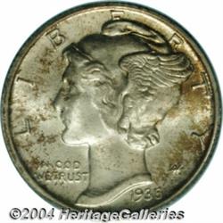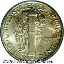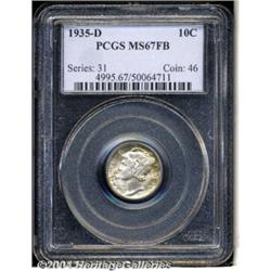 <B>1935-D<10C> MS67 Full Bands PCGS.</B></I> This Superb Gem Mercury has russet toning over portions of both sides, exhibits great luster, has a razor-sharp strike, and nearly mark-free surfaces. Population: 14 in 67, 0 finer (7/04). <BR><BR><B>Important notice:</B> Heritage usually auctions material at the rate of 200-250 lots per hour. On some occasions eBay Live bid software or the Internet may not be able to keep up with the pace of the auction. We recommend placing a realistic absentee bid now as insurance to avoid disappointment. Occasionally the auctioneer may eliminate or reject an eBay Live bid, and the auctioneer may also reopen a lot after the close of the eBay live bidding (usually because we missed an audience bid), and may reject your bid even if it shows you as the winning bidder. By bidding via eBay Live, you agree that Heritage may award the lot to another bidder at its sole discretion under the circumstances described above or any other reasonable circumstances. Since eBay bids are not shown to us until we open the lot on the floor, we treat those bids just like floor bids. In most cases the floor responds before the eBay bid is presented to us, due to Internet lag time, so for consistency we have made it a policy that floor bids are always considered first over tie eBay live bids. Also please note that all Heritage lots purchased through eBay Live carry a 20% Buyer's Premium. Please make sure you read the Terms and Conditions before you bid. </span></font></tr></table></td></tr></table>