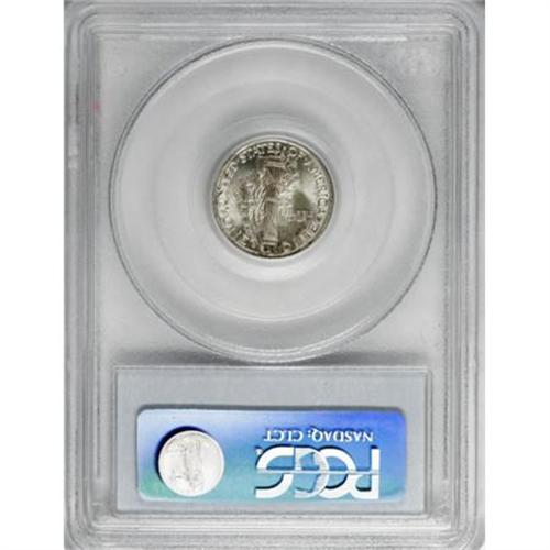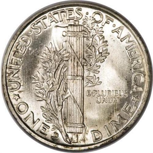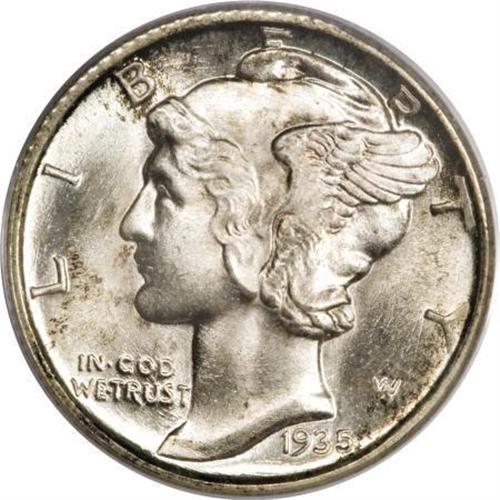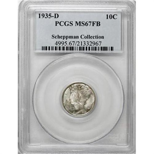 <B>1935-D 10C MS67 Full Bands PCGS.</B></I> Several factors combine for spectacular visual appeal on this outstanding Depression-era D-mint dime. Its bold strike is an obvious plus, as the fully split and rounded bands on the fasces can attest. A hint of frostiness visits the devices, while the fields offer powerful luster. Splashes of silver-blue and tan toning grace each side. Tied for the finest Full Bands example certified by either NGC or PCGS (12/07).<BR><I>From The Scheppman Collection, #4 PCGS Registry of Full Band Mercury Dimes.</B></I><BR><BR><B>Coin Engraver:</B> Adolph A. Weinman<BR><BR><b>Shipping:</b> Coins & Currency (<a target="_blank" href="http://www.heritageauctions.com/common/shipping.php">view shipping information</a>)