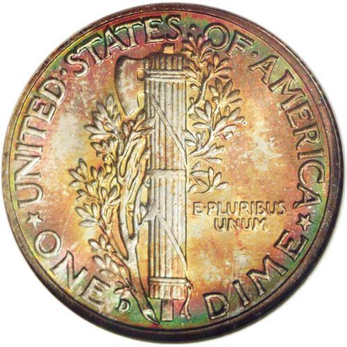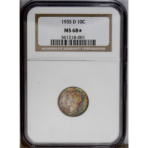 <B>1935-D<10C> MS68 <img border='0' src='http://www.heritagecoins.com/images/star.gif' width=10 height=10> NGC.</B></I> Boldly struck with visually bewitching crimson, golden-orange, lemon-yellow and bright-green iridescence intermingled over both sides, around patches of standard steel-gray color. The central reverse bands are tantalizingly close to being fully split. Exquisitely preserved, the Superb surfaces are nearly blemish-free. The single-finest graded example of this issue, at NGC, in the absence of an MS68 Full Bands representative. Census: 1 in 68 <img border='0' src='http://www.heritagecoins.com/images/star.gif' width=10 height=10>, 0 finer (3/06).