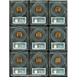 1935-D 1C MS66 Red PCGS, pumpkin-gold color domina <B>1935-D 1C MS66 Red PCGS,</B></I> pumpkin-gold color dominates; <B>1938-D MS67 Red PCGS,</B></I> free from contact or carbon; <B>1944-S MS67 Red PCGS,</B></I> large S, lovely peach-red hues; <B>1945-S MS67 Red PCGS,</B></I> knob S, deep orange-red color; <B>1947 MS66 Red PCGS,</B></I> a decent strike, nearly carbon-free; <B>1950 MS66 Red PCGS,</B></I> microscopic aqua flecks; <B>1953-D MS66 Red PCGS,</B></I> vibrant luster, a few tiny flyspecks; <B>1954-D MS66 Red PCGS,</B></I> booming luster, bright canary-gold color; and a <B>1956 MS66 Red PCGS,</B></I> boldly struck and attractive. 9 Coins <BR><BR><B>Important notice:</B> Heritage usually auctions material at the rate of 200-250 lots per hour. On some occasions eBay Live bid software or the Internet may not be able to keep up with the pace of the auction. We recommend placing a realistic absentee bid now as insurance to avoid disappointment. Occasionally the auctioneer may eliminate or reject an eBay Live bid, and the auctioneer may also reopen a lot after the close of the eBay live bidding (usually because we missed an audience bid), and may reject your bid even if it shows you as the winning bidder. By bidding via eBay Live, you agree that Heritage may award the lot to another bidder at its sole discretion under the circumstances described above or any other reasonable circumstances. Since eBay bids are not shown to us until we open the lot on the floor, we treat those bids just like floor bids. In most cases the floor responds before the eBay bid is presented to us, due to Internet lag time, so for consistency we have made it a policy that floor bids are always considered first over tie eBay live bids. Also please note that all Heritage lots purchased through eBay Live carry a 20% Buyer's Premium. Please make sure you read the Terms and Conditions before you bid. This lot is being auctioned in conjunction with a live floor auction by Heritage Galleries & Auctioneers. All final auction and invoice information will be supplied by Heritage Galleries & Auctioneers, and all other information should be considered preliminary. Lot:5334