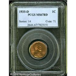 1935-D 1C MS67 Red PCGS. Fully struck and pristine <B>1935-D 1C MS67 Red PCGS.</B></I> Fully struck and pristine, with bright red-orange color and substantial gleaming luster. An amazingly well preserved Superb Gem. Population: 65 in 67, 1 finer (11/04).<BR><I>From The Dennis Dewart Collection.</B></I> <BR><BR><B>Important notice:</B> Heritage usually auctions material at the rate of 200-250 lots per hour. On some occasions eBay Live bid software or the Internet may not be able to keep up with the pace of the auction. We recommend placing a realistic absentee bid now as insurance to avoid disappointment. Occasionally the auctioneer may eliminate or reject an eBay Live bid, and the auctioneer may also reopen a lot after the close of the eBay live bidding (usually because we missed an audience bid), and may reject your bid even if it shows you as the winning bidder. By bidding via eBay Live, you agree that Heritage may award the lot to another bidder at its sole discretion under the circumstances described above or any other reasonable circumstances. Since eBay bids are not shown to us until we open the lot on the floor, we treat those bids just like floor bids. In most cases the floor responds before the eBay bid is presented to us, due to Internet lag time, so for consistency we have made it a policy that floor bids are always considered first over tie eBay live bids. Also please note that all Heritage lots purchased through eBay Live carry a 20% Buyer's Premium. Please make sure you read the Terms and Conditions before you bid. This lot is being auctioned in conjunction with a live floor auction by Heritage Galleries & Auctioneers. All final auction and invoice information will be supplied by Heritage Galleries & Auctioneers, and all other information should be considered preliminary. Lot:5178