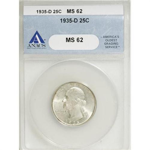 <B>1935-D 25C MS62 ANACS.</B></I> . NGC Census: (56/676). PCGS Population (56/1248). Mintage: 5,780,000. Numismedia Wsl. Price for NGC/PCGS coin in MS62: $225. (#5798)<BR><BR><B>Coin Engraver:</B> John Flanagan<BR><BR><b>Shipping:</b> Coins & Currency (<a target="_blank" href="http://www.heritageauctions.com/common/shipping.php">view shipping information</a>)