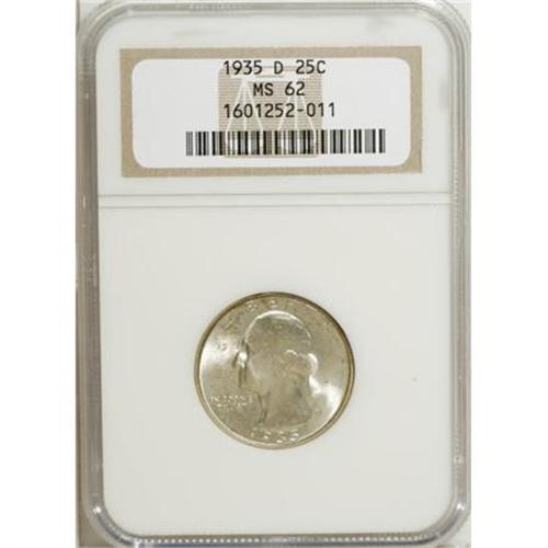 <B>1935-D 25C MS62 NGC.</B></I> NGC Census: (55/637). PCGS Population (44/1198). Mintage: 5,780,000. Numismedia Wsl. Price for NGC/PCGS coin in MS62: $221. (#5798)<BR><BR><B>Coin Engraver:</B> John Flanagan<BR><BR><b>Shipping:</b> Coins & Currency (<a target="_blank" href="http://www.heritageauctions.com/common/shipping.php">view shipping information</a>\)