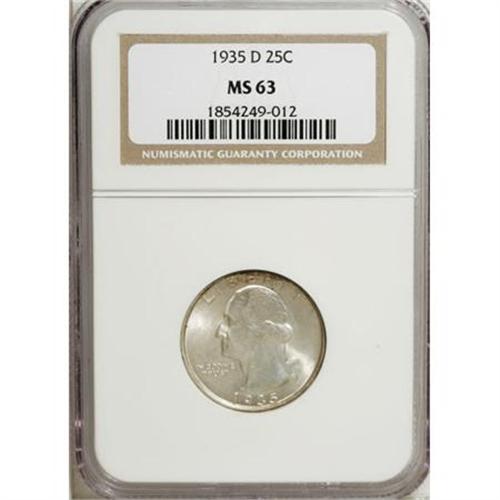 <B>1935-D 25C MS63 NGC.</B></I> NGC Census: (83/554). PCGS Population (159/1039). Mintage: 5,780,000. Numismedia Wsl. Price for NGC/PCGS coin in MS63: $250. (#5798)<BR><BR><B>Coin Engraver:</B> John Flanagan<BR><BR><b>Shipping:</b> Coins & Currency (<a target="_blank" href="http://www.heritageauctions.com/common/shipping.php">view shipping information</a>\)