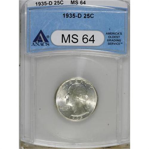 <B>1935-D 25C MS64 ANACS.</B></I> NGC Census: (271/309). PCGS Population (568/515). Mintage: 5,780,000. Numismedia Wsl. Price for NGC/PCGS coin in MS64: $390. (#5798)<BR><BR><B>Coin Engraver:</B> John Flanagan<BR><BR><b>Shipping:</b> Coins & Currency (<a target="_blank" href="http://www.heritageauctions.com/common/shipping.php">view shipping information</a>)