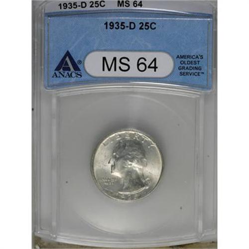 <B>1935-D 25C MS64 ANACS.</B></I> NGC Census: (271/309). PCGS Population (568/515). Mintage: 5,780,000. Numismedia Wsl. Price for NGC/PCGS coin in MS64: $390. (#5798)<BR><BR><B>Coin Engraver:</B> John Flanagan<BR><BR><b>Shipping:</b> Coins & Currency (<a target="_blank" href="http://www.heritageauctions.com/common/shipping.php">view shipping information</a>)