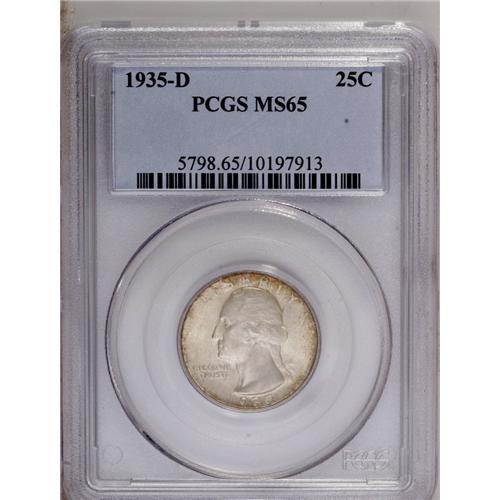 <B>1935-D<25C> MS65 PCGS.</B></I> Gold and aqua patina enriches the borders of this otherwise cream-gray Gem. The strike is decisive throughout, and no marks of any consequence are detected. An early, low mintage date.
