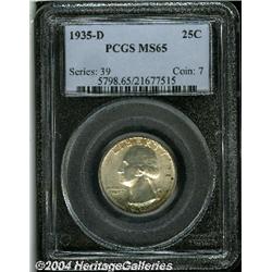 <B>1935-D<25C> MS65 PCGS.</B></I> A few reddish-brown splotches are noted in the right obverse field, with the remaining surfaces essentially untoned. A small contact mark is noted on each of the eagle's legs. <BR><BR><B>Important notice:</B> Heritage usually auctions material at the rate of 200-250 lots per hour. On some occasions eBay Live bid software or the Internet may not be able to keep up with the pace of the auction. We recommend placing a realistic absentee bid now as insurance to avoid disappointment. Occasionally the auctioneer may eliminate or reject an eBay Live bid, and the auctioneer may also reopen a lot after the close of the eBay live bidding (usually because we missed an audience bid), and may reject your bid even if it shows you as the winning bidder. By bidding via eBay Live, you agree that Heritage may award the lot to another bidder at its sole discretion under the circumstances described above or any other reasonable circumstances. Since eBay bids are not shown to us until we open the lot on the floor, we treat those bids just like floor bids. In most cases the floor responds before the eBay bid is presented to us, due to Internet lag time, so for consistency we have made it a policy that floor bids are always considered first over tie eBay live bids. Also please note that all Heritage lots purchased through eBay Live carry a 20% Buyer's Premium. Please make sure you read the Terms and Conditions before you bid.