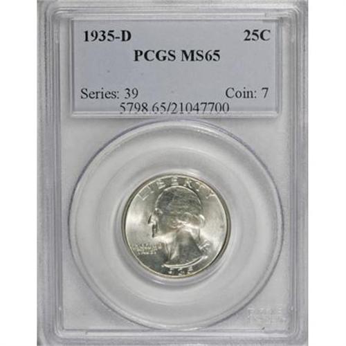 <B>1935-D 25C MS65 PCGS.</B></I> Delicate champagne accents grace the lustrous surfaces of this early D-mint Washington quarter. Well struck with excellent visual appeal and careful preservation consistent with the grade.<BR><BR><B>Coin Engraver:</B> John Flanagan<BR><BR><b>Shipping:</b> Coins & Currency (<a target="_blank" href="http://www.heritageauctions.com/common/shipping.php">view shipping information</a>)