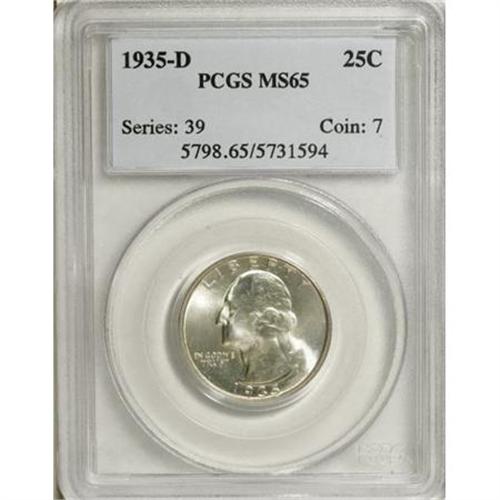 <B>1935-D 25C MS65 PCGS.</B></I> . PCGS Population (349/165). NGC Census: (234/77). Mintage: 5,780,000. Numismedia Wsl. Price for NGC/PCGS coin in MS65: $710. (#5798)<BR><BR><B>Coin Engraver:</B> John Flanagan<BR><BR><b>Shipping:</b> Coins & Currency (<a target="_blank" href="http://www.heritageauctions.com/common/shipping.php">view shipping information</a>)