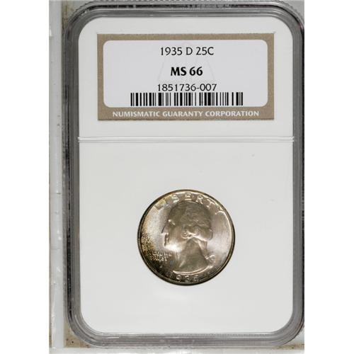 <B>1935-D<25C> MS66 NGC.</B></I> Washington quarter aficionados probably recognize this issue as one of the semikeys to the series, along with the 1936-D and 1937-S. Pale rose patina with flecks of brown and jade coat the obverse, while the reverse yields to mottled ochre and copper hues. Pristine and lustrous, even underneath the deep reverse toning. NGC has graded five finer (7/06).