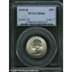 1935-D 25C MS66 PCGS. Freckles of tan and aquamari <B>1935-D 25C MS66 PCGS.</B></I> Freckles of tan and aquamarine color visit the lower obverse margin. A sharply struck and shimmering premium Gem that has exceptionally clean surfaces. The reverse border is widely strike doubled. The early branch mint issues are the scarcest of the series. <BR><BR><B>Important notice:</B> Heritage usually auctions material at the rate of 200-250 lots per hour. On some occasions eBay Live bid software or the Internet may not be able to keep up with the pace of the auction. We recommend placing a realistic absentee bid now as insurance to avoid disappointment. Occasionally the auctioneer may eliminate or reject an eBay Live bid, and the auctioneer may also reopen a lot after the close of the eBay live bidding (usually because we missed an audience bid), and may reject your bid even if it shows you as the winning bidder. By bidding via eBay Live, you agree that Heritage may award the lot to another bidder at its sole discretion under the circumstances described above or any other reasonable circumstances. Since eBay bids are not shown to us until we open the lot on the floor, we treat those bids just like floor bids. In most cases the floor responds before the eBay bid is presented to us, due to Internet lag time, so for consistency we have made it a policy that floor bids are always considered first over tie eBay live bids. Also please note that all Heritage lots purchased through eBay Live carry a 20% Buyer's Premium. Please make sure you read the Terms and Conditions before you bid. This lot is being auctioned in conjunction with a live floor auction by Heritage Galleries & Auctioneers. All final auction and invoice information will be supplied by Heritage Galleries & Auctioneers, and all other information should be considered preliminary. Lot:5993