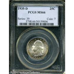 1935-D 25C MS66 PCGS. Lustrous surfaces are visite <B>1935-D 25C MS66 PCGS.</B></I> Lustrous surfaces are visited by a mix of golden-brown, violet, crimson, and sky-blue toning, being much more evident on the obverse. The design features are well struck throughout. A few tiny milling marks are noted on the eagle's breast and legs. Population: 117 in 66, 9 finer (10/04). <BR><BR><B>Important notice:</B> Heritage usually auctions material at the rate of 200-250 lots per hour. On some occasions eBay Live bid software or the Internet may not be able to keep up with the pace of the auction. We recommend placing a realistic absentee bid now as insurance to avoid disappointment. Occasionally the auctioneer may eliminate or reject an eBay Live bid, and the auctioneer may also reopen a lot after the close of the eBay live bidding (usually because we missed an audience bid), and may reject your bid even if it shows you as the winning bidder. By bidding via eBay Live, you agree that Heritage may award the lot to another bidder at its sole discretion under the circumstances described above or any other reasonable circumstances. Since eBay bids are not shown to us until we open the lot on the floor, we treat those bids just like floor bids. In most cases the floor responds before the eBay bid is presented to us, due to Internet lag time, so for consistency we have made it a policy that floor bids are always considered first over tie eBay live bids. Also please note that all Heritage lots purchased through eBay Live carry a 20% Buyer's Premium. Please make sure you read the Terms and Conditions before you bid. This lot is being auctioned in conjunction with a live floor auction by Heritage Galleries & Auctioneers. All final auction and invoice information will be supplied by Heritage Galleries & Auctioneers, and all other information should be considered preliminary. Lot:5994