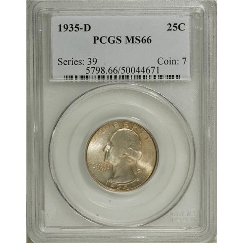 <B>1935-D 25C MS66 PCGS.</B></I> Mottled burnt orange and cinnamon cover attractive, lustrous surfaces that offer virtually no distractions to the eye. Sharply struck throughout.<BR><BR><b>Shipping:</b> Coins & Currency (<a target="_blank" href="http://www.heritageauctions.com/common/shipping.php">view shipping information</a>)