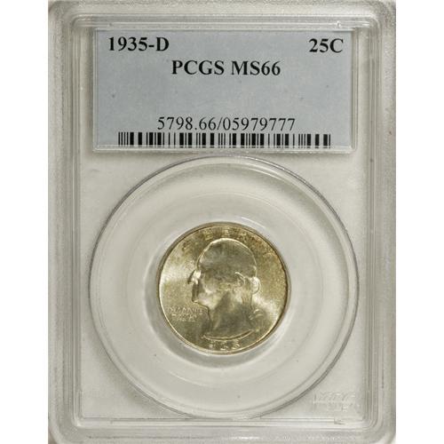 <B>1935-D 25C MS66 PCGS.</B></I> Sea-green and straw-gold shades grace this fully lustrous and highly attractive Premium Gem. Well struck save for the centers of a few peripheral letters.<BR><BR><b>Shipping:</b> Coins & Currency (<a target="_blank" href="http://www.heritageauctions.com/common/shipping.php">view shipping information</a>)