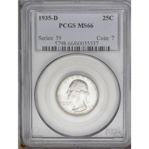 <B>1935-D<25C> MS66 PCGS.</B></I> Well struck with full satin luster and pleasing reddish-tan and sky-blue peripheral toning on both sides. A small milling mark is noted above the O in GOD. An exceptionally attractive example of this elusive, semi-key D-mint quarter. PCGS has graded only 11 pieces finer.